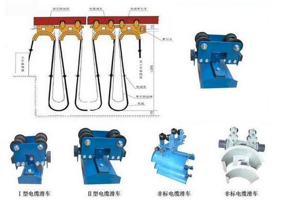 GHC型系列工字鋼電纜滑車裝置用于移動供電機械在移動中電纜的懸吊與移動,已廣泛應用于各類起重機械中。工字鋼電纜滑車該裝置具有結構堅固。移動靈活。安全可靠等優點。GHC型滑車由牽收引滑車、電纜滑車、終端滑車三部分組成,牽引滑車跟隨移動機械導纜(牽引)裝置,每個移動機械配1個,隨移動機械往返運行。中間電纜滑車將電纜懸掛在工字鋼軌道范圍內隨牽引滑車移動,兩端并裝有緩沖撞頭,滑車視移動長度不同而定數量。終端滑車固定在工字鋼導軌末端,一般每個移動機械設置1個。工字鋼電纜滑車該系列滑車分Ⅰ、Ⅱ、Ⅲ、Ⅳ、Ⅴ五種型號,如用戶采用12#、14#、16#或更大號數工字鋼,可在訂貨時注明,本廠可成套供貨。