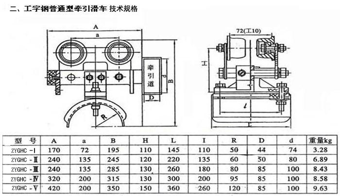 ZYGHC型工字鋼電纜滑車系列分為中載荷型、重載荷型和輕載荷型,因此滑車行走輪為Φ80、Φ63、Φ50的三種。承載能力<50~150kg,每類按托板層數分為單層、雙層、三層,每類中有三種形式。首端為電纜牽引車,終端為固定掛線架,中間為電纜滑車,該系列滑車分Ⅰ、Ⅱ、Ⅲ、Ⅳ、Ⅴ五種型號,如用戶采用12#、14#、16#或更大號數工字鋼,可在訂貨時注明,本公司可成套供貨。