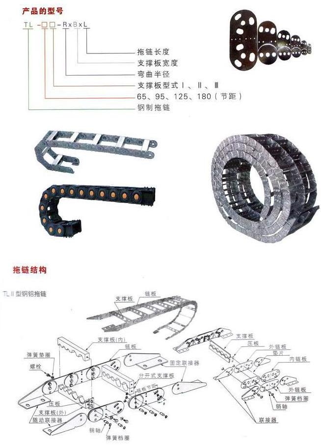 TL系列鋼制電纜拖鏈,銷軸及支撐板和隨動連接器等零件組成。拖鏈可適用最大移動速度為40米/分,拖鏈安全使用壽命不少于100萬次(往復)。該產品具有設計精巧、使用靈活等特點,被廣泛應用與冶金、鋼鐵、鑄造、大型機械等行業作為短距離,油、氣、水軟管和電纜同時移動之用。