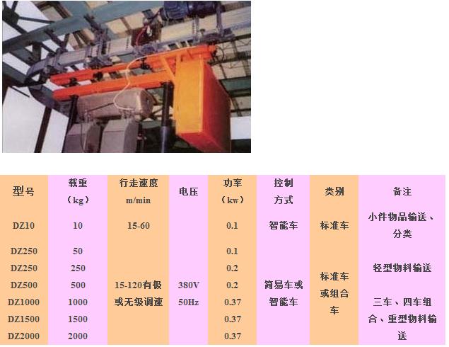 電動自行小車輸送系統是在水平、垂直方向都能自由行走的單軌系統。由軌道、道岔、升降裝置、電控系統五大部分組成。廣泛地應用于機械、化工、汽車生產流水線、檢測線和郵電、醫院、海關等部門小件物品輸送。
