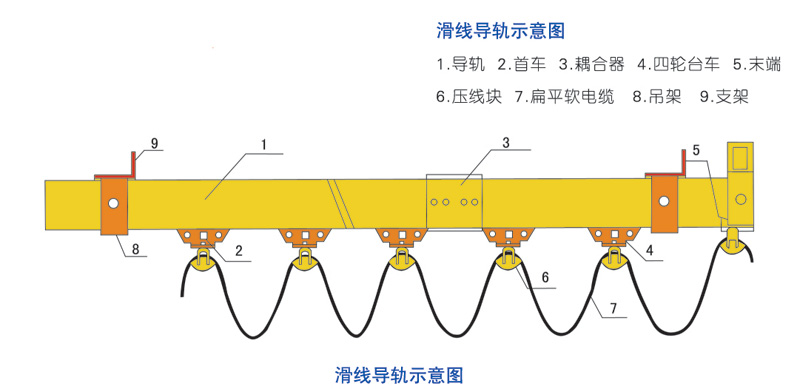 HXDL系列電纜滑軌由軌道、攜纜小車、電纜以及懸吊、固定等組件組合而成。該產品以其簡捷的結構、完備的性能被廣泛地應用于鐵路貨場、港口碼頭以及煙草機械等行業的起重運輸機械的移動供電和信號輿系統中。